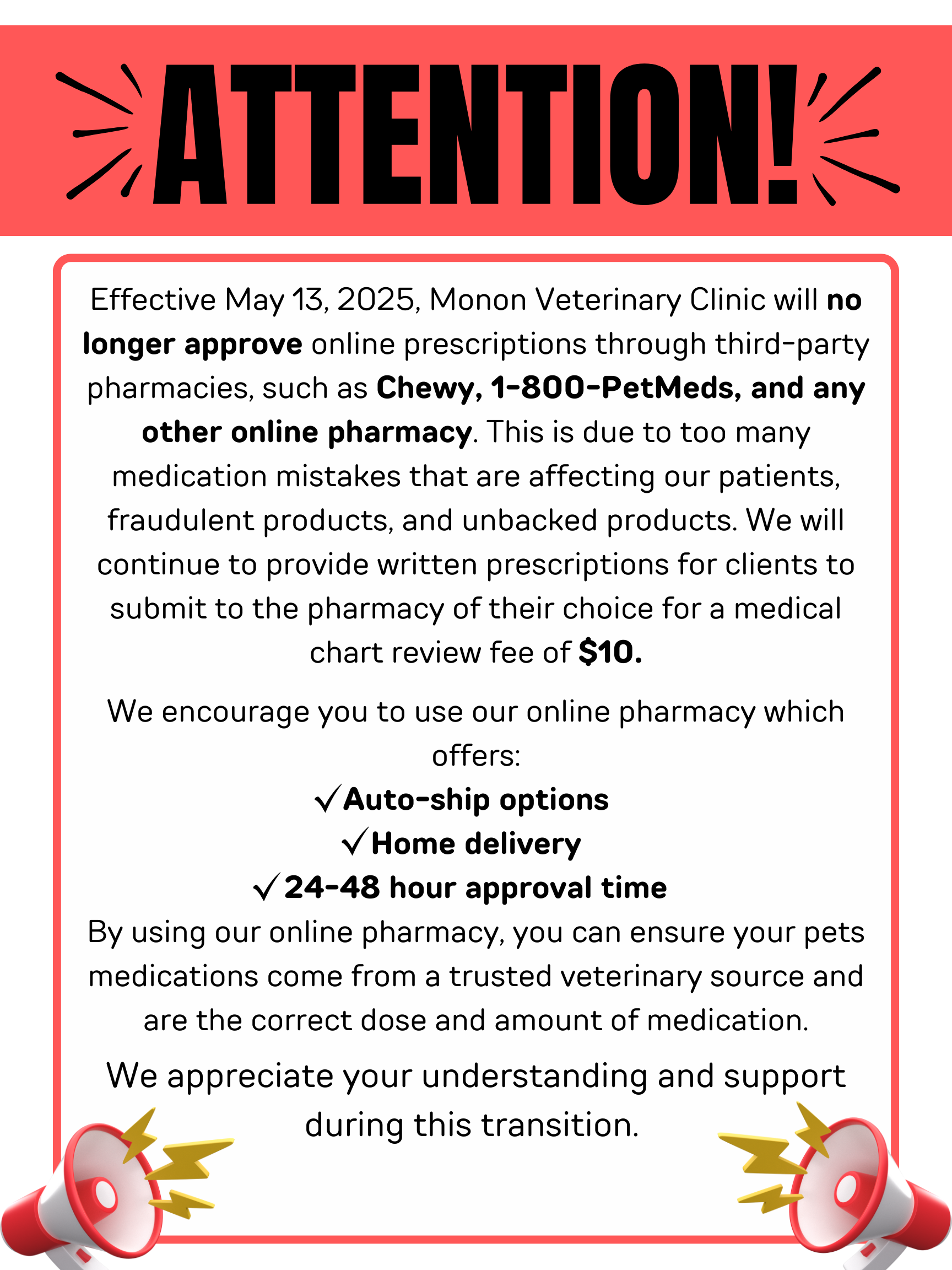 We will NO LONGER approve any prescriptions through ANY 3rd party pharmacies. If you still wish to order from a 3rd party pharmacy for your pets medications, there is a $10 medical chart review fee.